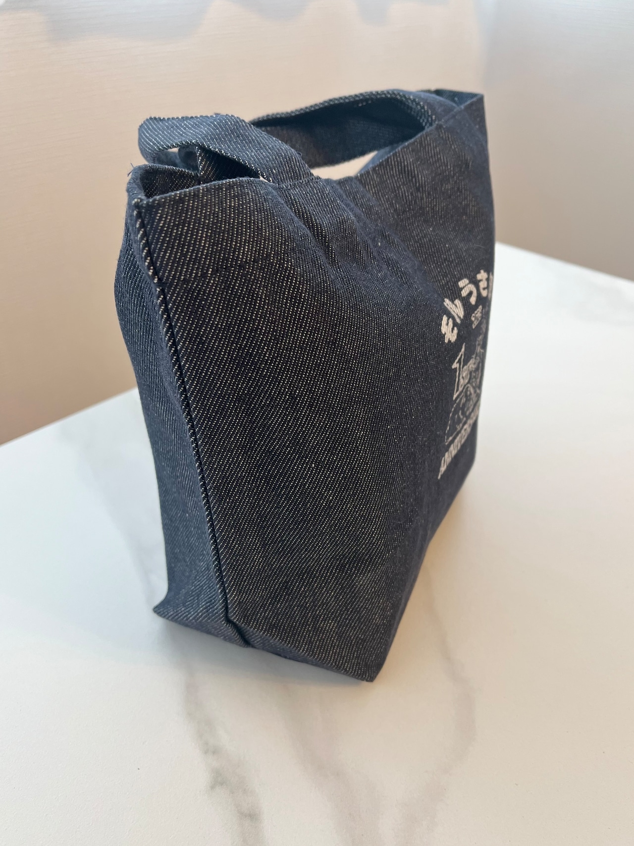地球に優しいリサイクルデニムを使用したモルうさ部のロゴ入りランチトートです。
